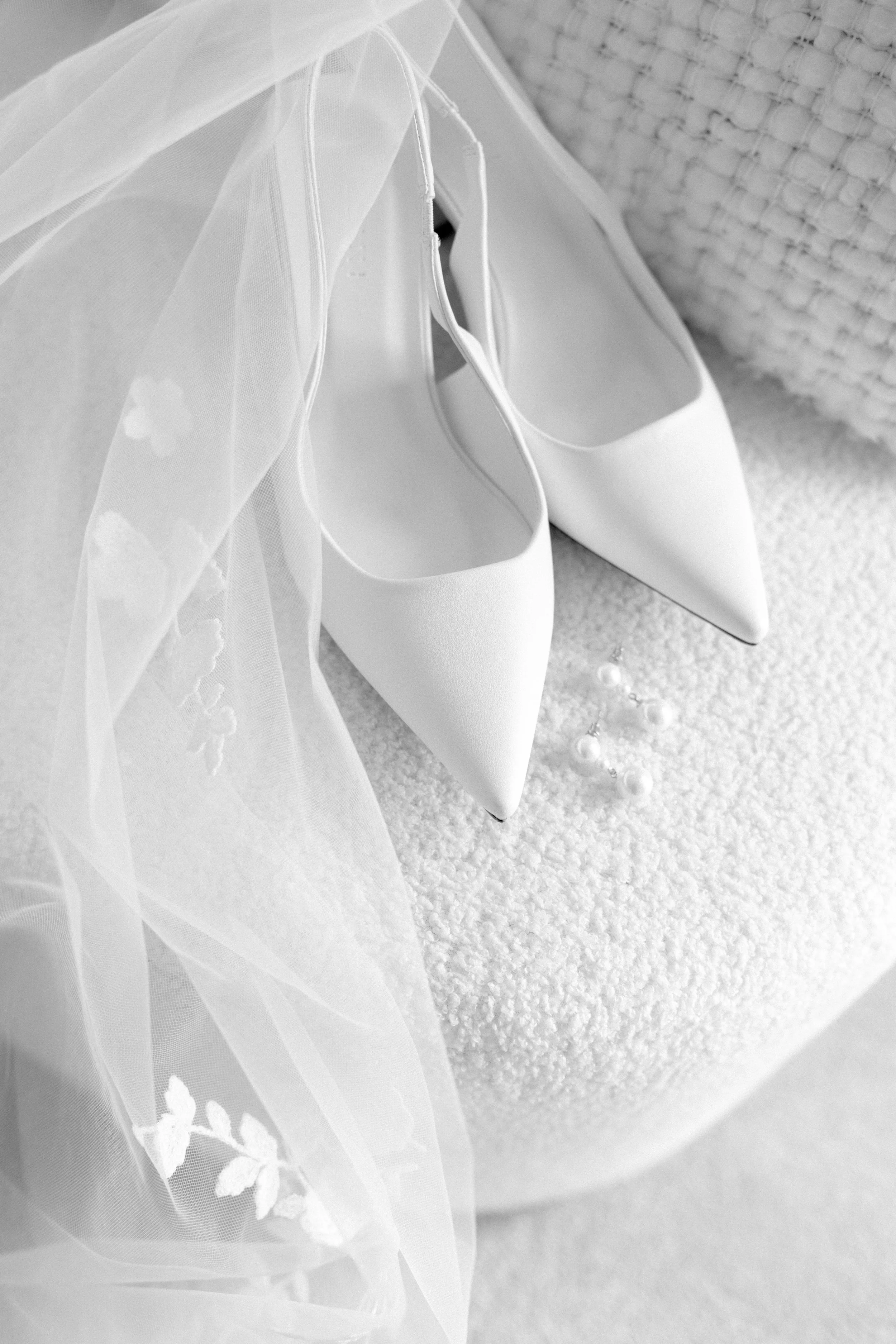 Editorial shot of a wedding details featuring, white bridal shoes, a veil and pearl earrings on a textured surface.