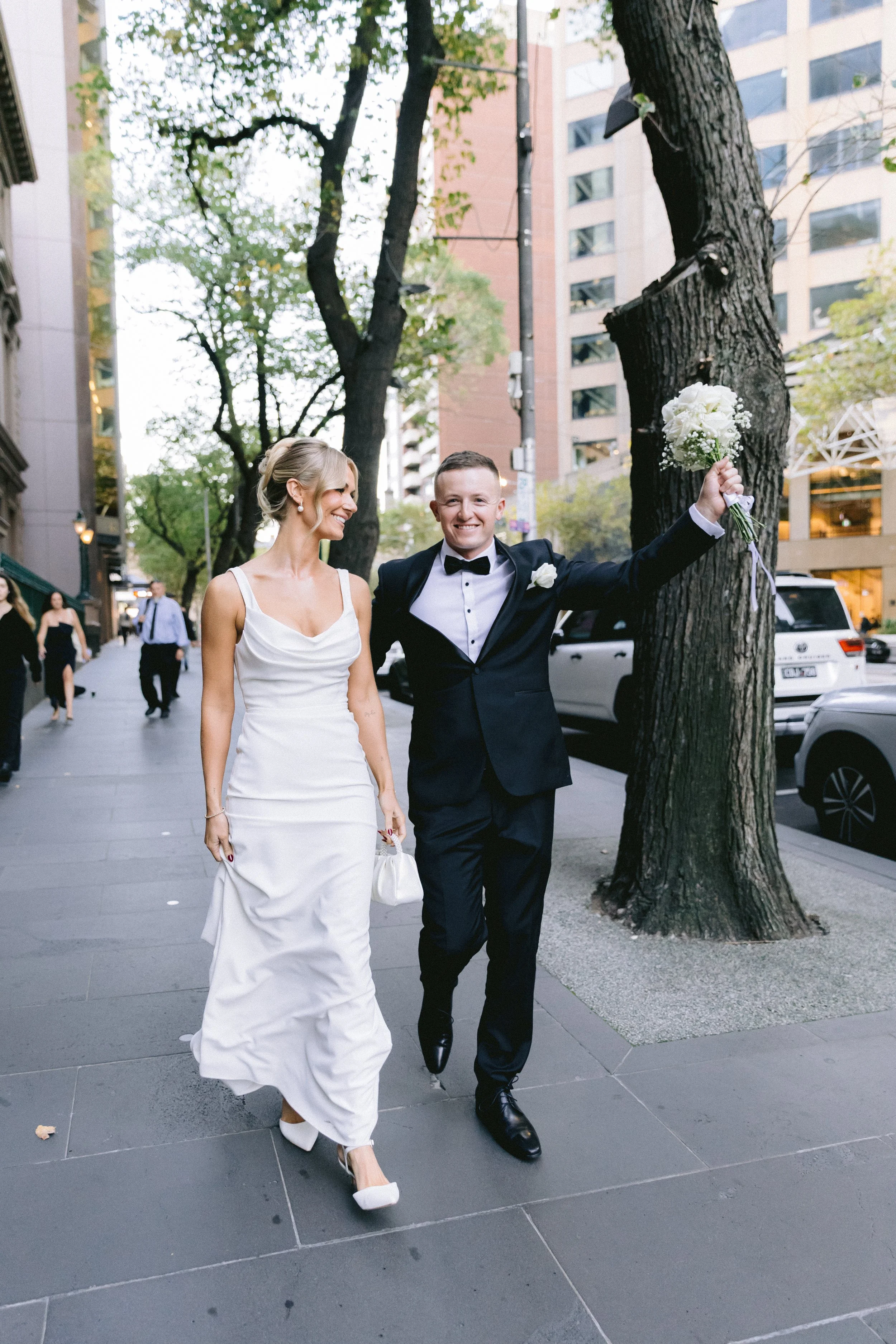Editorial wedding photography moments. A man in a suit carrying a woman in a wedding dress on a street, with parked cars and trees in the background of Brunswick, Melbourne.